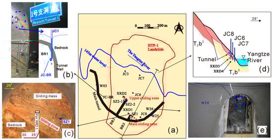(a) Sampling locations of landslide area. (b) Photo and schematic of the sampling environment for sample JC-BR. (c) Photograph of the sampling environment for samples SZ1 and XRD-1 at the sliding surface. (d) A profile view showing the location of boreholes and tunnels, as well as the positions of samples XRD-3 and XRD-4. (e) Photograph of the sampling environment for the water sampling window on the tunnel wall (using W26 as an example).