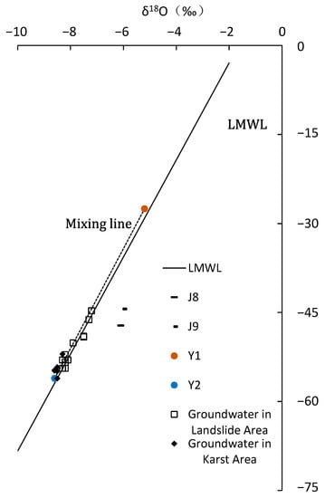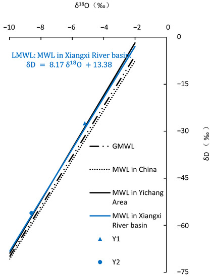 In Figure 7, the stable isotopic data of precipitation in the study area are distributed along the meteoric water lines of Yichang and the Xiangxi River basin. Thus, the meteoric water line in Xiangxi River basin, which is closer to Badong, was selected as the local meteoric water line (LMWL), expressed as: