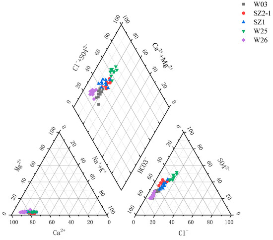 Water chemistry monitoring for one year showed that the pH of the groundwater samples in the landslide area ranged from 7.25 to 8, with electrical conductivity between 320 and 686 µs/cm. The concentration of HCO3− ranged from 64 to 268 mg/L, Cl− concentration ranged from 11.74 to 41.11 mg/L, NO3− concentration ranged from 5.32 to 82.58 mg/L, SO42− concentration ranged from 62.11 to 120.34 mg/L, Ca2+ concentration ranged from 52.02 to 121.30 mg/L, K+ concentration ranged from 0.41 to 5.73 mg/L, Mg2+ concentration ranged from 1.65 to 5.64 mg/L, and Na+ concentration ranged from 8.22 to 26.28 mg/L. The water chemistry test results were analyzed using a Piper trilinear diagram, as shown in Figure 8. The main hydrochemical types of LGW were determined to be HCO3·SO4-Ca and SO4·HCO3-Ca types according to the Schukalev classification method (SCM).