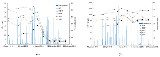 The Piper diagram analysis of the water chemistry testing results did not consider the NO3−, which is a typical indicator ion of pollution and is usually derived from human activities. Due to the huge potential for catastrophic landslides on the Huangtupo landslide, the entire town of approximately 20,000 people began to migrate to the west side of the slope from 1992 onwards. The cost of the town relocation was enormous, and it was not until July 2015 that the last batch of residents on the Huangtupo landslide completed their evacuation. As can be seen from Figure 9a, the NO3− concentration in the groundwater of the landslide area has significantly decreased since August 2015, which is consistent with the changes in human activities. In January 2016, the NO3− concentration in groundwater at each site ranged from 11.76 mg/L to 5.32 mg/L. Compared with January of the previous year (when the concentration range of sulfate ions at each site was 76.72 mg/L to 18.76 mg/L), this significant decrease indicates that the NO3− ion in the groundwater comes entirely from the residents’ daily life on the landslide.