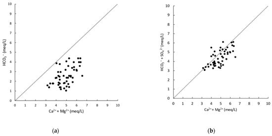 Ion relationship diagram. (a) (HCO3−) vs. (Ca2+ + Mg2+), and (b) (HCO3− + SO42−) vs. (Ca2+ + Mg2+).