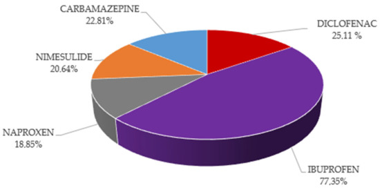 The detection of certain micropollutants—for example, drug residues—in wastewater reflects pharmaceutical consumption [10]. Human activity, impoverished areas and also environmental factors can pose a major risk to the cleanliness of our waters [13,14,15]. The Price Support Department of the National Health Insurance Fund Management (hereinafter: NEAK) publishes the sales data for subsidized medicinal products on a monthly basis, complying with the defined protocol [16]. After extracting the data published by NEAK on 24 February 2022, we examined the data on active substances sold in Budapest and Pest County in relation to the national data, which is illustrated in Figure 1. As the figure shows, the largest quantities of tablets and capsules containing the active substance ibuprofen (hereinafter: IBU) were bought in Budapest and Pest County, which is 77.35% of the national sales.