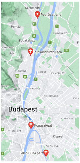 We collected water samples from four sampling sites. At the first and second sampling sites (Szentendre, Postás Beach; Békásmegyer, Pünkösdfürdő Street), we took the samples from a tributary: the Szentendrei Danube branch. The third sampling location (Budapest, District XI, Kopaszi Dam) provided samples from the main branch of the Danube, while the samples collected from the last sampling location (Budapest, District XX, Upper Danube bank) were taken from the Ráckevei–(Soroksári) –Danube branch, separated by the Kvassay floodgates.