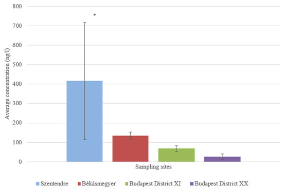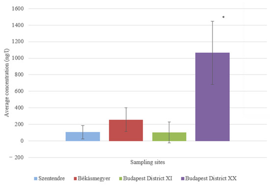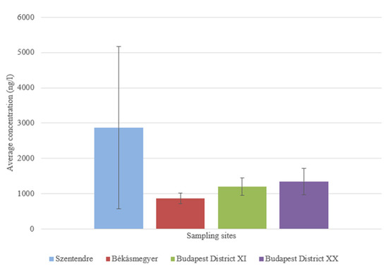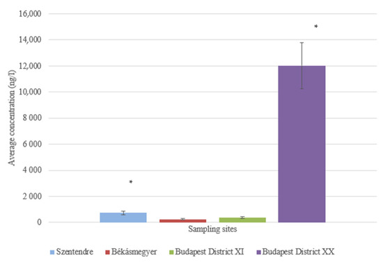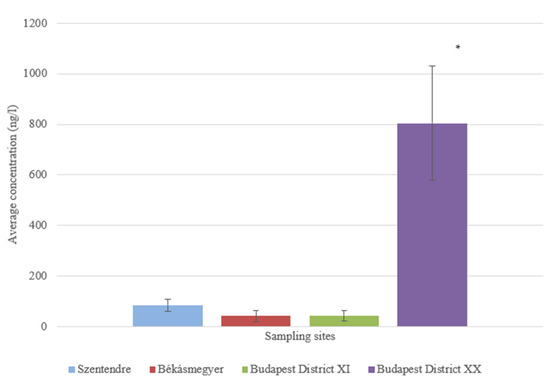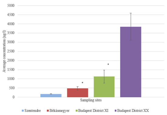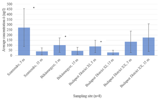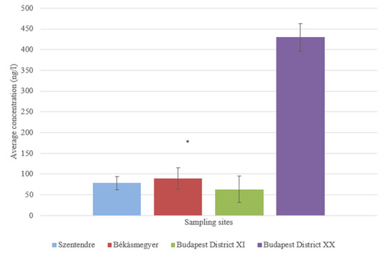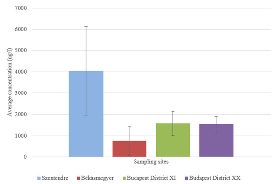 At the sampling site in Budapest District XI, an average of 1576.571 ± 549.002 ng/L was found in the sample taken from 5 m, while an average of 1197.849 ± 248.042 ng/L was found in the sample taken from 15 m from the bank. No significant difference (p = 0.0797) could be measured in water samples taken 5 and 15 m from the riverbank.
