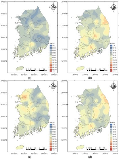 Figure 6 shows the contour maps of SPMP for each scenario and period using precipitation data from 615 sites. The SPMPs increased as the period was extended from 2040 to 2100 for both scenarios, even though their spatial distributions differed somewhat for each scenario.