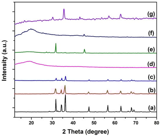 XRD pattern of (a) ZnO, (b) Fe(ZnO), (c) 3-MPS-Fe(ZnO), (d) poly(styr-co-MMA) (e) poly(styr-co-MMA)-3MPS-Fe(ZnO), (f) EDA-poly(styr-co-MMA)-3MPS-Fe(ZnO) (MFZPI), and (g) Sulphonated-EDA-poly(styr-co-MMA)-3MPS-Fe(ZnO) (SMFZPI).