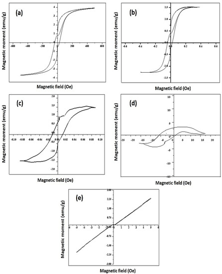 B-H hysteresis loops of (a) Fe(ZnO), (b) 3-MPS-Fe(ZnO), (c) poly(styr-co-MMA)-3MPS-Fe(ZnO), (d) EDA-poly(styr-co-MMA)-3MPS-Fe(ZnO) (MFZPI), and (e) Sulphonated-EDA-poly(styr-co-MMA)-3MPS-Fe(ZnO) (SMFZPI).