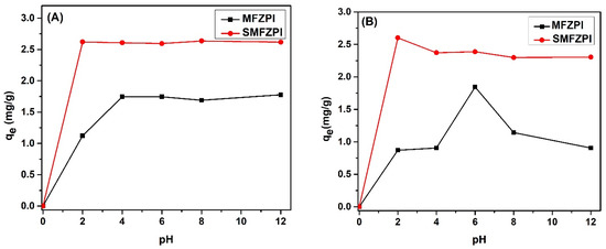 The influence of pH (2–12) on the sorption capacity of MFZPI and SMFZPI against (A) Cr(III), and (B) Fluorescein (solution concentration = 10 mg/L, sorbent dose = 30 mg, and temperature = 293K).