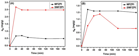 The influence of contact time (20–180 min) on the sorption capacity of MFZPI and SMFZPI against (A) Cr(III), and (B) Fluorescein (solution concentration = 10 mg/L, sorbent dose = 30 mg, and temperature = 293K).