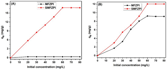 The influence of initial concentration (10–80 ppm) of metal/dye on the sorption capacity of MFZPI and SMFZPI against (A) Cr(III), and (B) Fluorescein (sorbent dose = 30 mg, and temperature = 293K).
