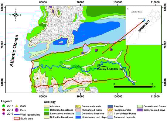 - Bahir, M.; Mennani, A.; Jalal, M.; Youbi, N. Contribution à l’étude des ressources hydriques du bassin synclinal d’Essaouira (Maroc). Estud. Geol. 2000, 56, 185–195. [Google Scholar] [CrossRef]