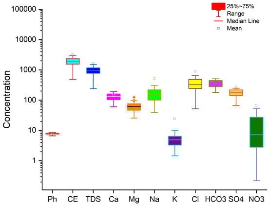 Boxplots were used to analyze the relative influence of different chemical parameters on groundwater chemistry. The boxplots showed each variable’s median, lower and upper quartiles, and non-outlier range. The analysis revealed that EC and TDS showed the most significant variability, while pH, Ca2+, Mg2+, K+, SO4−, and NO3− showed the least variability. Na+, HCO3−, and Cl− showed moderate variability (Figure 2).