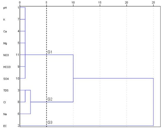 All variables were logarithmically transformed, and nearly matched normally distributed data were used. Three primary groups have been identified in the dendrogram of the nine physicochemical parameters (EC, TDS, pH, Ca2+, Na+, K+, Mg2+, Cl−, SO42−, HCO3−, and NO3−) (Figure 3). A specific phenon line was selected at a connection distance of 5, and the specified phenon line [] was selected.