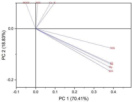 Table 6 shows the Pearson’s correlation matrix, which indicates significant correlations between groundwater variables. TDS displayed a strong positive correlation with Na+, SO42−, and Cl− concentrations, while Mg2+, Na+, K+, and Cl− also exhibited significant correlation. Moreover, Cl−, Ca2+, and K+ showed a moderately positive correlation, whereas NO3− concentration demonstrated a weak correlation with SO42−, Cl−, HCO3−, and Na+ parameters.