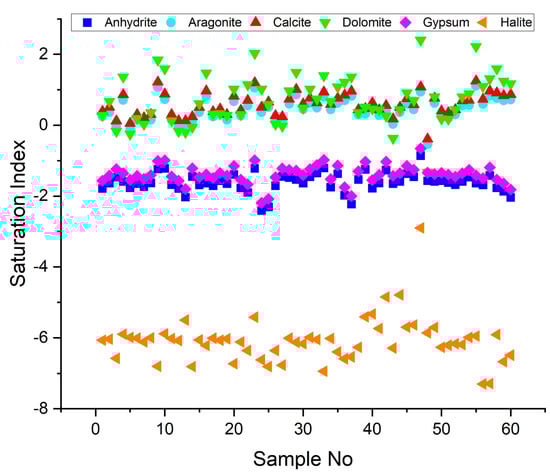 The cations present in the samples were ordered in descending abundance as follows: Na+ > Ca2+ > Mg2+ > K+, with sodium (Na+) being the dominant cation at most sample sites, ranging from 39.15 to 7117 mg/L (mean value of 507.68 mg/L). Calcium (Ca2+) (60.67–341.06 mg/L) and magnesium (Mg2+) (25.57–817.47 mg/L) were also significant contributors to the mineralogical composition of the samples. Potassium (K+) had an average concentration of 25.31 mg/L, with a range of 1.46–230.98 mg/L.
