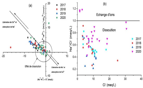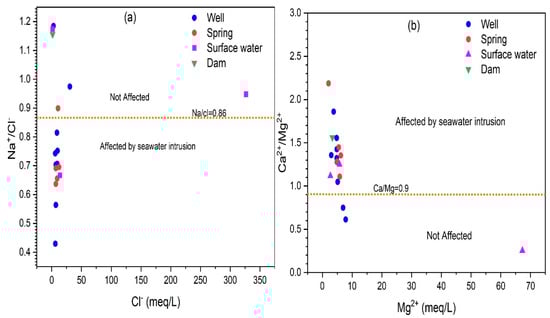 The analysis of major chemical elements of the campaigns (2017, 2018, 2019) was analyzed in ENS (Ecole Normale Supérieure, Marrakech, Morocco). The volumetric analysis of TH (as CaCO3) and Ca2+ was performed using standard EDTA. The Mg2+ was calculated, taking the difference value between TH and Ca2+. A flame photometer was used for the estimation of Na+ and K+ ions. The volumetric method was used to estimate the HCO3− and CO32− using HCl as a standard solution. The Cl was analyzed by titrating with standard AgNO3. The turbidimetric method was used to determine SO42−, and the colorimetric method was used to determine NO3−. The EC is expressed in micro-siemens per centimeter (μS/cm) at 25 °C. The chemical ions are expressed in milligrams per liter (mg/L) and milliequivalents per liter (meq/L).