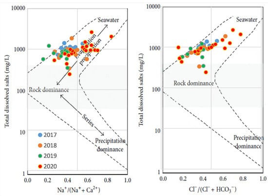 - Gibbs, R.J. Mechanisms controlling world water chemistry. Science 1970, 170, 1088–1090. [Google Scholar] [CrossRef]