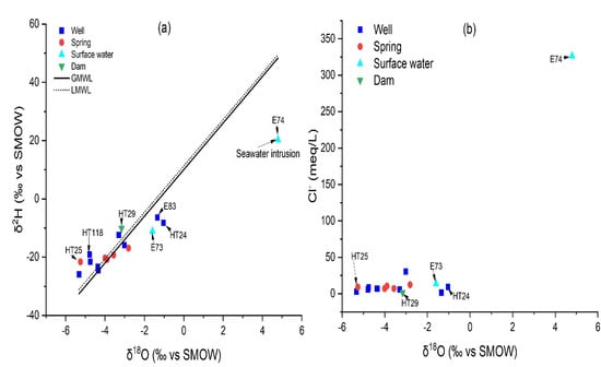 - Craig, H. Isotopic variations in meteoric waters. Science 1961, 133, 1702–1703. [Google Scholar] [CrossRef]