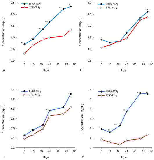 Water quality parameters of IPRA and TPC. Various forms of nitrogen ((a)—NO2−N, (b)—NO3−N, (c)—ammonia nitrogen) and (d)—PO43−P were tested over the experimental period. * Indicates significant (p < 0.05), ** indicates highly significant (p < 0.01).
