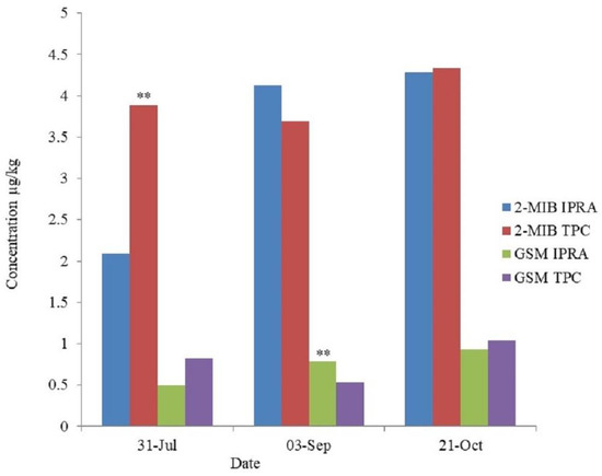 2-MIB and geosmin levels in flesh of grass carp from in-pond raceway aquaculture (IPRA) and traditional pond culture (TPC). Note: ** indicates highly significant (p < 0.01).