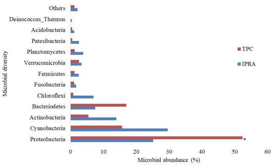 The study documented 12 different phyla of microbial mass in IPRA and TPC water environments (Figure 3). Cyanobacteria (29.59%) was the most abundant microbial mass, followed by Proteobacteria, Actinobacteria, Bacteriodetes, and Chloroflexi in IPRA, while Proteobacteria showed the dominating abundance in TPC, followed by Cyanobacteria, Bacteriodetes, and Actinobacteria. The abundance of Proteobacteria was observed to be significantly higher (p < 0.05) in TPC, whereas the richness of Planctomycetes was observed to be significantly higher (p < 0.05) in IPRA than in TPC.
