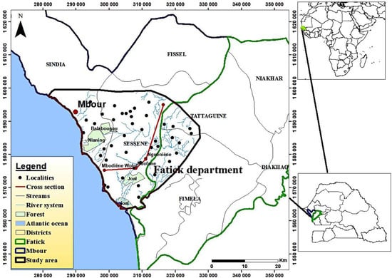 The study area is located in the central western part of Senegal and includes the departments of Mbour (Thiès region) and Fatick (Fatick region). It is located in the groundnut basin and also includes part of the districts of Sindia, Sessene, Tattaguine and Fimela. It covers an area of 971 km2. It is bounded to the North by the districts of Notto and Fissel, to the East by those of Niakhar and Diakhao, to the Southeast by the bolongs which are part of the tributaries of the Saloum River and to the West by the Atlantic Ocean (Figure 1). Its climate is of the dry tropical type characterized by the alternating of two seasons: A short rainy season that lasts about 4 months (July to October) and a very long dry season (November to June) with the influence of two types of wind: the cool, humid and non-rainy maritime trade winds and the hot and dry Harmattan season. The rainfall data, acquired during the period from 1991 to 2020 and from 1990 to 2020 respectively in Mbour and Fatick, shows that the average annual rainfall is respectively 561 mm and 595 mm. The highest rainfall amounts are recorded during the months of August and September (Figure 2). The influence of dry season winds (maritime trade winds and Harmattan) leads to high evaporation in the area. In fact, the average potential evaporation is 1600 mm/year and 2200 mm/year in Mbour and Fatick respectively. The relative humidity in the study area is high during the rainy season and is generally above 65%. In Mbour, the average monthly maximum temperatures are observed during the months of July and November with a maximum of 28.7 °C recorded in October. From December to May, temperatures are quite low with a minimum of 25.4 °C in January. In Fatick, from March to October, average monthly temperatures vary between 29.3 °C and 30.5 °C. The lowest temperatures are recorded during December and January with 26.4 °C and 25.6 °C respectively.