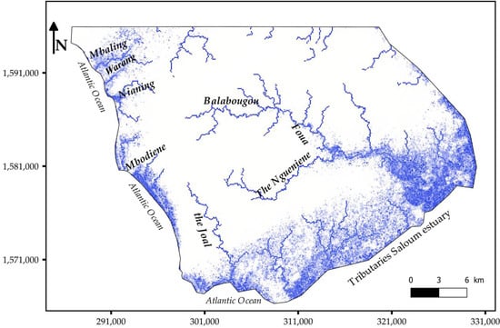 The fairly dense pattern of the drainage system indicates that it was very important during wet periods. The present drainage pattern consists of thalwegs that are dry for a long period of the year (Figure 4). Its functioning depends on the amount of annual rainfall. This hydrographic network is divided into two groups: the small marigots that flow towards the ocean (Baling, Warang, Nianing and Mbodiène) and the tributaries of the Saloum. The latter (Foua, Balabougou and Nguéniène marigots) collect all of the water from the thalwegs and drain it into the tannes. This water is then discharged into the mouths of the Saloum and then into the sea to the west.