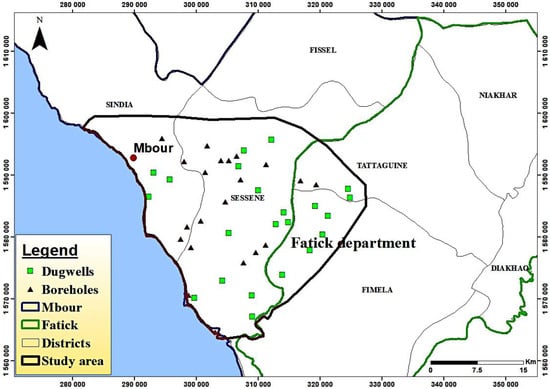Groundwater is considered worldwide as a vital and essential water resource for drinking, domestic, industrial and agricultural activities due to non-perennial flow and poor quality of surface water []. In many countries, especially in rural and coastal areas of arid and semi-arid regions, groundwater is the main resource available to meet domestic, agricultural and industrial water needs. According to Nickson et al., 2005 [] about one-third of the world’s population use groundwater for drinking purpose with or without treatment. Central west of Senegal is concerned and affected by scarcity evolution, diminution of rainfalls, combined with rapid growth of population and industrial and agricultural activities; leading to overexploitation of groundwaters. Consequences are a considerable decline in groundwater levels and a progressive degradation of their chemical quality, as observed in others regions []. Groundwater quality depends on several factors such nature of recharge, hydrologic gradient, residence time of groundwater in the aquifer, pollution by anthropogenic activities and rock–water interactions beneath the surface []. Several past studies have been carried out to determine the quality of water and especially its suitability for domestic and agricultural use [,,,]. Our study is focused on groundwater characteristics to determine the quality of water and, in particular, its suitability for drinking, domestic or agricultural use. Previous works in the Senegalese sedimentary basin [] and the Mbour area [] showed strong mineralization of groundwater with occurrence of high fluoride content. Thus, to assess groundwater quality of the study area, hydrochemical and physical characteristics have been performed on 42 samples collected in order to estimate its quality for human uses: drinking and irrigation purposes. We used different international parameters and indicators as total dissolved solid, (TDS), total hardness (TH), water quality index (WQI), sodium adsorption ratio (SAR), residual sodium carbonate (RSC), sodium percent (%Na), permeability index (PI), Kelly ratio (KR), magnesium ratio (MR). Objectives are to determine the characteristics of the hydrogeochemistry groundwaters sampled, to estimate the ratio or percentage of waters suitable for drinking and irrigation purposes. One of the objectives of this work is to demonstrate that each index calculated and used is important and provides information on the quality of the water according to the uses envisaged and the targets concerned. This work is of importance because there are very few published studies on this region of central western Senegal. Thus, this study provides the scientific community and stakeholders with quantified elements (in the form of percentage of water suitable for human consumption or agriculture). Nevertheless, as with any study, this work describes a situation in a constant evolution, which requires monitoring in order to meet the challenges of climate and sustainable development.