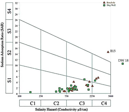 SAR is an important water quality parameter to measure the suitability of water for irrigation use. Effectively excessive sodium content, relative to the calcium and magnesium, can deteriorate the soil characteristics; Thereby reducing the soil permeability and structure [,,]. The use of water with high content of SAR requires soil amendments to prevent long-term damage of soil. Sodium in water can displace the calcium and magnesium in soil, leading to a decrease in infiltration and permeability of the soil []. As proposed by Richards [], groundwater samples having SAR values less than 10 are considered excellent quality for irrigation, 10 to 18 as good, 18 to 26 as fair, and above 26 are unsuitable for irrigation use. The computed values of SAR in the study area ranged from 0.5 to 14.6 with an average value of 2.6. Based on the above classification, majority of groundwater samples (95%) fall in the excellent water category. The remaining 5% belong to good category of water, suitable for irrigation purpose. The US Salinity Laboratory diagram (USSL) was used to confirm water quality assess for irrigation purpose. The USSL salinity diagram (Figure 6) reveals that the majority of the groundwater samples (64%) fall in the field C3S1. It indicates high salinity and low sodium water category acceptable for irrigation, for almost all type soils type with little risk due to exchangeable sodium [,]. Such use is conditioned by good drainage of the soils because the high salinity may affect crop growth causing osmotic effects and nutritional disorders []. In addition, 16% of groundwater samples belong to C2S1 category, indicating medium salinity and low alkalinity water. They can be used for irrigation with moderate leaching and moderate permeability leaching soil characteristics []. One sample fall in the field C1S1 category indicating low salinity and alkalinity allowing it use to irrigate most of soil and crops with less negative impact []. Groundwater falling in the category C3S2 represents around 2% of groundwater samples which can be used to irrigate salt tolerant and semi tolerant crops under adapted drainage conditions []. The remaining groundwater samples fall in the field C4S1 (2%), C4S2 (7%) and C4S4 (5%) indicating very high salinity and low to very high alkalinity. The C4S4 water category (very high salinity and very high alkalinity) is observed in borehole (B15) and Dug Well (DW18). They reveal high salinity water (EC= 4500 µS/cm), high chloride and sodium contents (Cl = 1107 and Na = 787 mg/L respectively) and anthropogenic pollution with high nitrate and sulfate contents (NO3 = 432 mg/L, SO4 = 432 mg/L). Such water is generally unfit for irrigation use in the farmland where restricted drainage occurred. Hence, irrigation use of such water may affect the yield of crops.