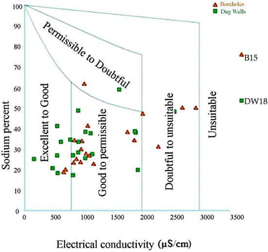 Sodium in soil is considered vital for determining groundwater suitability for irrigation purpose because Na+ reacts with soil reducing its permeability and little or no plant growth []. In addition, high concentrations of sodium in irrigation water tend to be absorbed by clays and to displace Ca2+ and Mg2+ by ion exchange, reducing the permeability and resulting in soil with poor drainage and thus limits air and water circulation during wet conditions [,,]. The computed values of %Na in the studied area range from 17 to 76% with an average value of 35%. Generally, this indicator allows classification: if the %Na is less than 20% water is excellent, good one, for %Na values ranging from 20 to 40%, permissible water for %Na values varying between 40 and 60%, doubtful water for %Na values ranging from 60 to 80% and unsuitable water for %Na values over 80%. According to this classification, most of the groundwater samples fall in excellent (12%) and good (62%) water type for irrigation. Around 21% and 5% fall respectively into permissible and doubtful water category. In addition, the diagram of Wilcox [] was used to study the integrated effect of electrical conductivity and sodium percent. Wilcox diagram indicates that 21% and 57% belong respectively to excellent to good and good to permissible for irrigation purpose. The remaining groundwater samples fall in the permissible to doubtful (5%), doubtful to unsuitable (12%) and unsuitable water category (5%) (Figure 7). The unsuitable water category is observed in borehole (B15) and Dug Well (DW18). These two points are characterized respectively by high salinity of water with high chloride and sodium contents (Cl = 1107 and Na = 787 mg/L) high nitrate and sulfate contents (NO3 = 432 mg/L, SO4 = 432 mg/L).