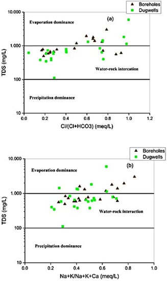Gibbs plot (a) TDS versus Cl−/(Cl− + HCO3−) and (b) TDS versus (Na+ + k+)/(Na+ + K+ + Ca2+).