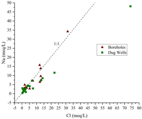 In addition, ionic ratio was generally used to determine the source of dissolved solutes ions in groundwater. Hence, the (Ca2+ + Mg2+)/HCO3− and Ca2+/Mg2+ ratios were often used to identify the source of calcium and magnesium in groundwater. Calcium and magnesium can be derived from weathering of Ca-bearing minerals such as calcite, dolomite and aragonite. If the ratio Ca2+/Mg2+ = 1, dissolution of dolomite should occur, whereas a ratio ranging from 1 to 2 is indicative of calcite contribution. However, higher Ca2+/Mg2+ molar ratio (>2) indicates the dissolution of silicate minerals, which contribute calcium and magnesium to groundwater [,,]. Furthermore, if Ca2+ and Mg2+ were only derived from the dissolution of carbonates in the aquifer minerals and from the weathering of accessory pyroxene or amphibole minerals, the ratio of (Ca2+ +Mg2+)/HCO3− would be about 0.5 []. The computed values Ca2+/Mg2+ ratio of the study ranged from 0.34 to 9.41. About 38% of groundwater samples shows Ca2+/Mg2+ ratio higher than 2 which is indicative of contribution of silicate minerals dissolution, whereas 21% of groundwater samples have a Ca2+/Mg2+ ionic ratio between 1 and 2 indicating the dissolution of calcite. The remaining groundwater samples (17) have a Ca2+/Mg2+ ratio less than 1 with 7 of them having a ratio close to 1 indicating the contribution of dolomite dissolution. Furthermore, the computed values of (Ca2+Mg2+)/HCO3− ratio show that all groundwater samples have values greater than 0.5. It suggests that dissolution of carbonate minerals and weathering of silicates are not the only sources of calcium and magnesium of waters. The plot of Na+ vs. Cl− (Figure 9) shows that some samples plot along the 1:1 line suggesting the halite dissolution another source of ions Na+ and Cl− in groundwater. However, most of groundwater samples fall below the 1:1 line revealing the dominance of Cl− over Na+ (Figure 9). The decrease of Na+ in groundwater samples may be due to other processes such as ion exchange. The ion exchange between groundwater and its host environment during residence or in movement processes are the important controlling factors for water chemistry variation in many areas. This ion exchange process is considered, in a previous study [] to be the or one of the main factors controlling the chemical composition of groundwater. In this study, the ion exchange process is investigated by reporting the chemical analysis results of groundwater samples on the binary diagram (Ca2+ + Mg2+ − SO42− − HCO3−) vs. [(Na+ + K+) − Cl−] (Figure 10). If cation exchange controls the ionic composition of groundwater, the relation between these two parameters should be linear with a slope of −1 []. In this study, the plot of groundwater samples on the scatter diagram (Ca2+ + Mg2+ − SO42− − HCO3−) vs. [(Na+ + K+) − Cl−] indicates that most of groundwater samples falls on or close a straight line with a slope of −1.12 with an r2 = 0.96 suggesting an occurrence of reverse ion exchange in groundwater.
