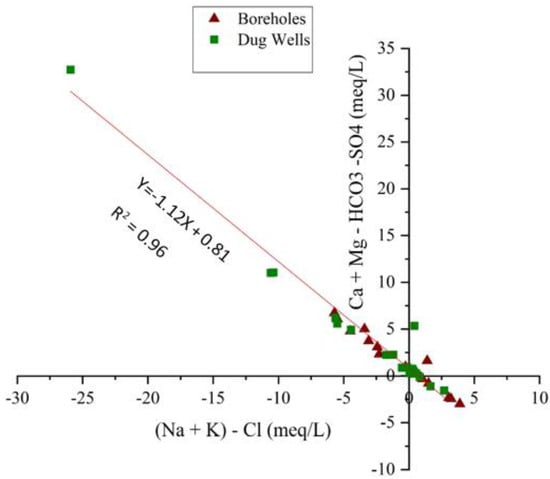 Scatter plot (Ca2+ + Mg2+ − SO42− − HCO3−) vs. (Na+ + K+) − Cl−.