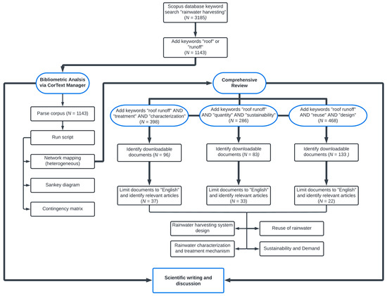 The research articles used for the bibliometric review were downloaded from the Scopus database [21]. As shown in the methodology framework in Figure 1, the initial search string inputted was TITLE-ABS-KEY (“rainwater harvesting”), resulting in 3117 documents. To filter the documents further and determine the articles relevant to roof rainwater harvesting, the keywords “roof” and “runoff” were added to the search string, resulting in 1123 documents. No filtration of articles from specific years was performed. The resulting documents were downloaded as a Research Information System (RIS) file on 23 August 2022 and parsed into a corpus using the CorText manager, an online software used to quantitatively assess scientific articles based on bibliometric information collected from a set of downloaded research articles [22]. Various scripts that include a network map of keywords, years, and countries, contingency matrices (keyword and journal; keyword and country), and a Sankey diagram of keywords were generated from the CorText Manager for the analysis of terms, references, and trends of topics related to roofing rainwater harvesting.