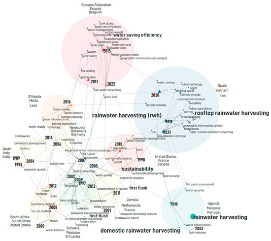 Heterogeneous network map of keywords, countries, and years of research articles collected from the Scopus search using the keywords “rainwater harvesting” and “roof” or “runoff”.