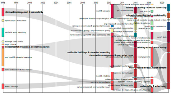 The Sankey diagram in Figure 3 shows the evolution of keywords relevant to roof rainwater harvesting. A darker-colored tube connecting two keywords denotes a strong relationship between the two keywords. In contrast, the thickness of the tube denotes the level of co-occurrence between the keyword and the particular year it belongs to. It can be seen that the years 1989 and 1993 are present in the network map but not in the Sankey diagram. The keywords generated from articles published in the mentioned years are represented in the 1996 column. Since the number of slices generated for the Sankey diagram was limited to five, keywords from articles published before 1996 were displayed in the next year, in which relatively more articles were published. It can be observed that stormwater management and sustainability have been relevant to roof rainwater harvesting since the 1990s. Furthermore, specific purposes of rainwater harvesting were found to be relevant to sustainability in the 2010s, such as “urban commercial infill” and “greywater reuse”. The most robust keyword relationship in the diagram was between “supplemental irrigation and economic analysis” and “residential buildings and rainwater harvesting”. This strong relationship indicates a significant evolution in the usage of harvested rainwater, from irrigation to domestic use. It can also be seen in the figure that most rainwater harvesting-related research prioritizes water savings, water demand, and drinking water. The keywords “GIS” and “remote sensing” in recent years indicate that advanced has been significantly involved in investigating the effectiveness and efficiency of rainwater harvesting.