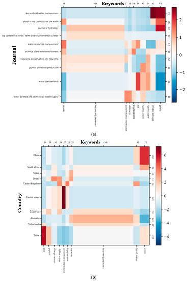 The co-occurrence between keywords and journals is shown in Figure 4b. The countries with the highest co-occurrence of the keyword “rainwater harvesting” were Australia, the Netherlands, and Malaysia. South Africa and Spain also had positive co-occurrence values with “rainwater harvesting”. A strong relationship was found between the keywords “runoff” in South Africa and “rainwater” in Spain and Australia. Furthermore, a strong co-occurrence was found between the keyword “stormwater management” and the United States. Other noticeable relationships include the high co-occurrence of India with the keyword “GIS” and China with the keyword “runoff”.