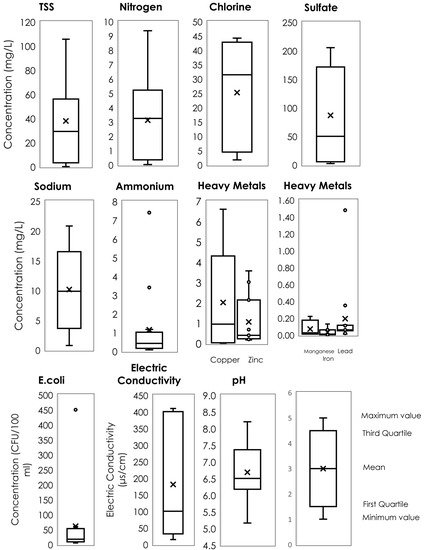 Figure 5 summarizes influent roof runoff concentration values obtained in the reviewed studies. The highest and lowest values for electrical conductivity are 410 μs/cm and 14.7 μs/cm, respectively. One of the high values of electrical conductivity is 105.59 mg/L which is found in asphalt-felt roof runoff in the study of Boguniewicz-Zabłocka and Capodaglio (2020) [6]. Nitrogen and chlorine content ranges from 9.36 mg/L to 0.02 mg/L and 44.22 mg/L to 1.72 mg/L, respectively. Sulfate comes from emissions of sulfur-containing compounds that occur primarily from the combustion of petroleum-derived fuels. These could easily combine with rainwater in the atmosphere.