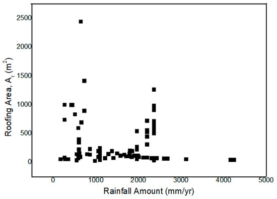Scatter plot of rainfall amount (mm/yr) and roofing area (m2) (n = 24).