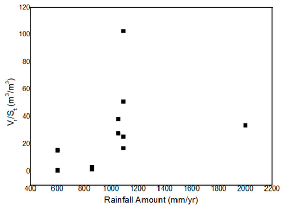 The rainfall amount, duration, intensity, and distribution contribute to the design and implementation of RWHS in any given location [52]. The quantity of rainwater that can be harvested should be considered, along with the purpose it will serve. Figure 6 shows the summary of the roofed area and its corresponding rainfall amount recorded in every study reviewed. Only 29% of the paper reviewed has a value greater than 500 m2, regardless of the rainfall amount. For example, a rainfall amount of only 640 mm/yr has a roofing area of 2450 m2 in the paper of Custodio and Ghisi (2019), whereas in the study of Sámano-Romero et al. (2016), a rainfall amount of 4239 mm/yr has a roofing area of only 50 m2 which shows that the recorded rainfall amount is usually not the basis for computing the area of the roof. However, most buildings’ roof spaces are not large enough to collect enough rainwater to meet demand [53]. Nevertheless, catchment area and catchment surface type can be changed to enhance system performance [54]. Due to the dynamic characteristics of rainfall, some studies consider the size of the storage tank rather than the roof area, which makes the storage tank the most significant expense in RWHS and domestic rainwater harvesting (DRWH) systems [55]. Areas with less rainfall would require small storage tanks for economic reasons. The study of rainfall and the area’s physical and social factors can help design the RWHS to make it reliable [56]. Figure 7, on the other hand, shows the relationship between the ratio of the runoff volume and tank size versus rainfall amount. The results indicate that as the rainfall amount recorded increases, the ratio of the runoff volume collected to the storage tank volume increases. The volume of roof runoff collected and tank size were critical in the preliminary design of an RWHS in one of the studies reviewed [11]. However, one study can be seen as an outlier. The R2 value is 0.2795, which implies that the data points are not closer to the mean value.