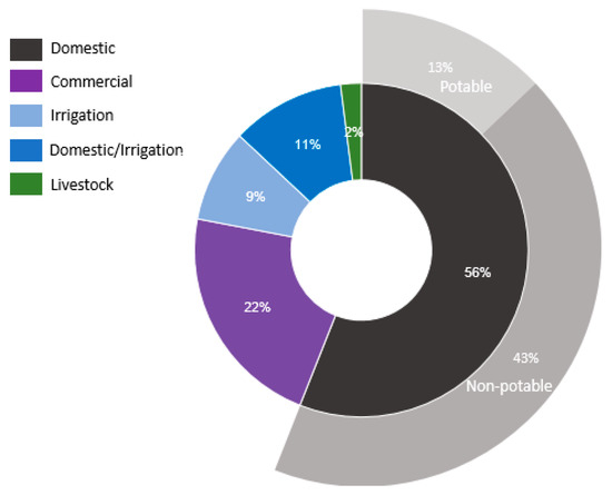 RWH can act as the primary water source in rural areas where the availability of water resources is a serious problem or as a complement to the main water supply in urbanized areas when integrated with the current conventional water delivery systems [54]. Rainwater collected using RWH systems can then be reused for other purposes. Figure 8 shows the percentage of studies reviewed with data on the reuse of rainwater harvested from roof runoff. Studies show that rainwater is typically used for domestic, commercial, irrigation, and livestock purposes. Among the 54 reviewed studies, 30 papers reviewed the use of rainwater for domestic purposes, of which 13 percent is potable, and 43 percent is non-potable. The rainwater collected from the roof is not potable and should not be used for drinking, but it can be used for flushing, cleaning, and gardening [57]. Nevertheless, treating it appropriately can serve its purpose as a potable water supply. Utilizing rainwater collected from rooftops can promote water sustainability and lessen the vulnerability of the water supply for homes and other uses [58]. In rural communities, especially in developing nations without access to safe drinking water supplies, rainwater harvesting (RWH) systems can produce drinking water [59]. Since the capacity of rainwater tanks to supply livestock holdings with water is greatly influenced by the research area’s regional characteristics, i.e., longer dry periods, tank design cannot be completely standardized [60]. Covered and uncovered rainwater tanks can also be employed to meet irrigation needs. According to Londra et al. (2021), the required tank sizes could lessen local pressure on water resources [61]. Additionally, RWH models are frequently used to assess various system designs, notably the sizing of rainwater tanks [62]. Using RWH can bridge the water deficit for agriculture and the amount of rainfall, lessening potential water system demands and subsidizing irrigation while promoting sustainable development [63].
