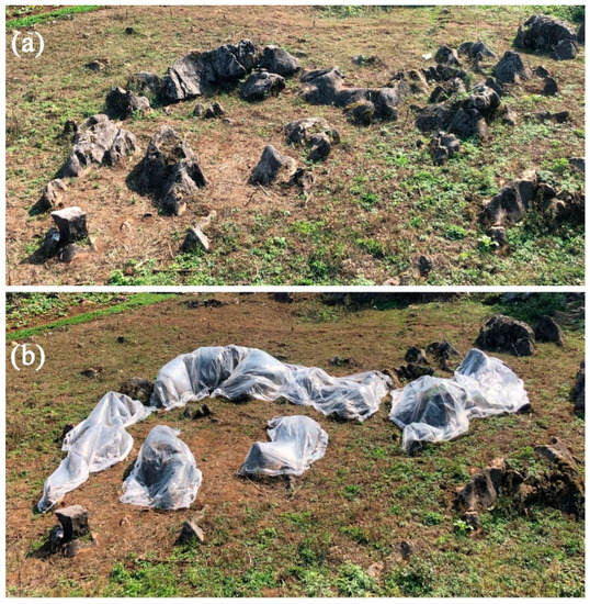 Rock film mulching on a karst rocky desertification plot. (a) No rock film mulching and (b) rock film mulching.