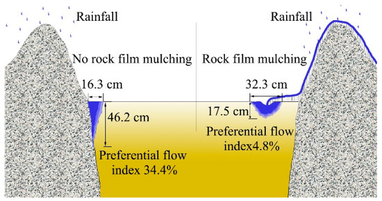 In contrast, the preferential flow in soil was not so obvious in the RFM. The water intercepted by a rock did not penetrate down along the rock–soil interface, but was transferred to the surrounding soil surface by the film cover on the above-ground rock. Under this treatment, the redistribution of water in the soil was confined to a range of 0~20 cm depth into the soil. The maximum depth of water flow paths was 22.4 cm, and the average depth was 17.6 cm, which was 61.9% lower than that under the treatment of no rock film. The maximum width of water flow paths was 41.3 cm, and the average width was 32.3 cm, which was 94.6% higher than that under the non-rock film treatment. The average preferred flow index was 4.8%, which was 86.0% lower than that of the NRFM.