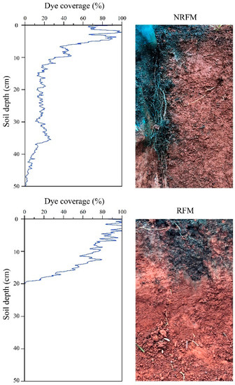 Change in dye coverage with soil depth in the dyeing profiles. NRFM (no rock film mulching), RFM (rock film mulching), soil profile (depth 50 cm × width 30 cm).