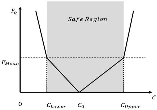 For each water quality sensor location, the penalty associated with residual disinfectant concentration was evaluated on the basis of a penalty-based function [,], as described in Figure 1. This is a different approach that does not restrict the water quality to be within the hard bounds of residual disinfection limits.