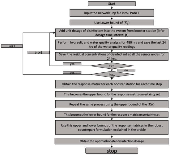 The presence of inherent uncertainty within water distribution systems (WDS) presents a significant challenge for deterministic optimization strategies employed for both the design and the operation of these systems. Such uncertainty can arise from multiple factors, including demand variability, fluctuations in supply, and variations in water quality modeling parameters []. The optimization of a water distribution system’s design and operations under uncertainty initially focused on hydraulic parameters using chance constraint formulations on demand and pressure head and pipe roughness coefficient constraints []. Later, reliability-based procedures to handle the uncertainties came into the subject [,,,,,,,,] Nevertheless, limited attention has been devoted to uncertainty in water quality parameters. Pasha et al. [,,] analyzed the impact of a few water quality parameters, including bulk and wall reaction coefficients and pipe diameters, on the water quality of distribution systems. It was determined that the uncertainty in the bulk reaction coefficient had the most predominant effect on consumer water quality. To further analyze the impact of this bulk-reaction coefficient uncertainty and its effect on the operation strategies involved in water quality control, Köker et al. [] studied the effect of uncertainty in the bulk reaction coefficient on the optimal booster disinfection dosage problem. To address this problem, chance constraint programming was utilized, in which the water quality constraints were formulated as chance constraints. Later, Wang and Zhu [,] proposed an inexact two-stage chance-constrained programming approach. To date, there have been no studies exploring non-probabilistic optimization techniques, such as robust optimization, to address the optimal booster chlorination problem under uncertainty.