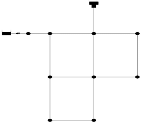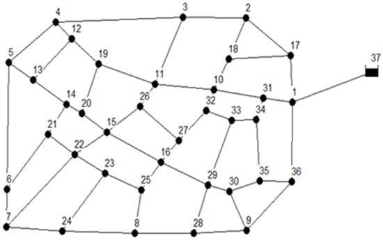 The Fossolo system, which serves the Fossolo neighborhood in Bologna, Italy, was modeled after its water distribution system. Its average demand is 3000 CMD, and it was initially introduced by Bragalli et al. in 2008 [] as part of a design study. A general diagram of the system can be seen in Figure 4. The Fossolo network (FOS) is a complex water distribution system comprising 58 pipes, 36 demand nodes, and a single reservoir that maintains a fixed head of 121.00 m. All the pipes in the network are constructed using high-density polyethylene with a roughness coefficient of 150, which is relatively high. The FOS network has been widely utilized in various research studies, including design optimization problems for water distribution systems [], optimal sensor placement for leak localization [], optimal pressure-reducing valve (PRV) placement [], leak detection studies [], and multi-quality optimization of the system [].