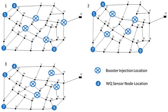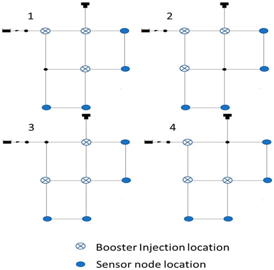For the second example network system, the Fossolo WDS was considered. This benchmark network is traditionally subjected to a single loading condition, which is available in the network database []. In order to analyze it under multiple loading conditions, the demand pattern used for the first network example (the NET-1 example) was applied to simulate the loading conditions for 24 h. Three different combinations of four booster chlorination locations were considered for the study, as shown in Figure 7. The water quality condition of the system was estimated from the measurements taken from four different sensor locations (nodes 4, 5, 7, and 9). The water quality measurements were taken for the last 24 h of the 480 h extended period simulation of the network at every 1 h interval. The network was assumed to have a chlorine level of 0.5 initially which degrades over time. The chlorine levels of the system are boosted from the booster injections. For each combination, the total mass injected and the penalty-based objective function were calculated for four different uncertainty sets of the decay rate coefficients {[−0.4, −0.6], [−0.3, −0.7], [−0.2, −0.8], [−0.1, −0.9]}.