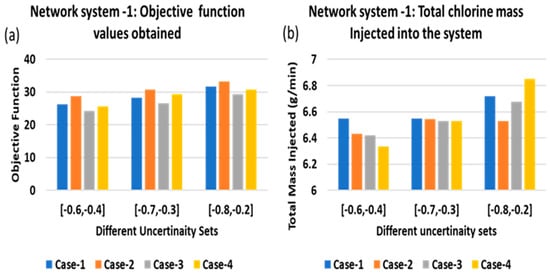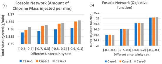 The analysis of water quality requires the consideration of the lower and upper bounds for chlorine concentration, which have been established at 0.2 mg/L and 4 mg/L [,], respectively. A simulation of the network was conducted for 480 h to ensure stability and periodicity, with the final 24 h of the simulation dedicated to calculating water quality for the estimation of the lower- and upper-bound response matrices. Four different cases were evaluated as shown in Figure 5 (numbered 1 to 4). Each case was obtained by fixing the location of the three booster stations (out of four possible choices) represented by the crossed circles in the Figure 5. The residual chlorine concentration was measured at hourly intervals over 24 h for each case. To evaluate the impact of uncertainty on decay rate coefficients, three different uncertainty sets were considered, namely {[−0.4, −0.6], [−0.3, −0.7], and [−0.2, −0.8]}. For each combination, the total mass injected and resulting penalty-based function values were calculated. The objective of the study was to determine the optimal total amount of chlorine injection that would ensure minimal deviation from the established limits. The results indicated that the optimal total amount of chlorine mass injected (mg/min) and the penalty-based objective function were influenced by the booster locations, with an increase in injection mass observed for larger reaction rate uncertainty sets. These findings are presented in Figure 6.