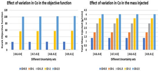 For this sensitivity analysis, the first case of the Fossolo network was considered with the lower and upper bounds of the network set as [0.2, 4] mg/L. The desired residual chlorine level varied between five different values {0.5, 1, 1.5, 2, 2.5}. The network was subjected to similar variations of the reaction rate coefficients {[−0.4, −0.6], [−0.3, −0.7], [−0.2, −0.8], [−0.1, −0.9]}. The total mass injected into the system as well as the objective function values were compared using bar graphs, as shown in Figure 9. The variation of the desired residual chlorine concentration had a significant effect on both the total chlorine mass injection as well as the penalty-based objective function. A unique trend of decrease and increase was observed in the objective function values. This variation can be explained because of the linear gradual increase in the objective function when moving from . As lies close to the center of the feasibility range of [0.2–4], the slight deviation from the desired concentration had a very small penalty.